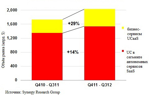 По данным аналитиков, 75% этого объема сервис-провайдеры получат от частных потребителей за счет предоставления услуг web- и видеоконференцсвязи и контант-центров. Но и значительно меньший на сегодня корпоративный сегмент этого рынка тоже растет очень быстро: за 2012 г. темпы роста увеличились более чем вдвое, и вскоре, по мнению аналитиков, бизнес-сегмент будет преобладать в общем объеме рынка UCaaS.