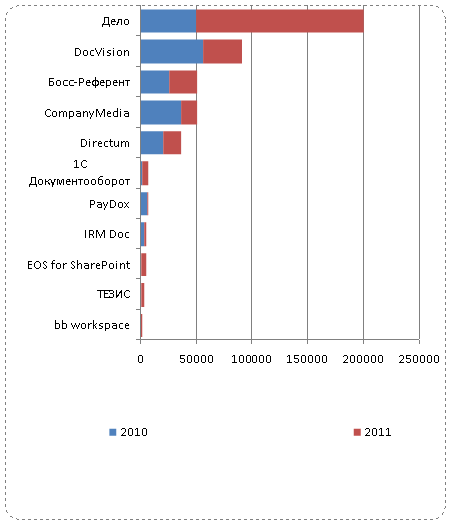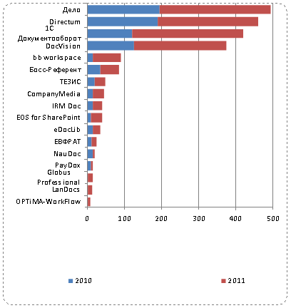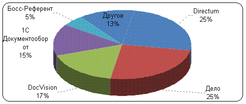 "Дело"(97,3% рабочих мест), eDocLib (0,3%), EOS for Sharepoint (2,4%) |