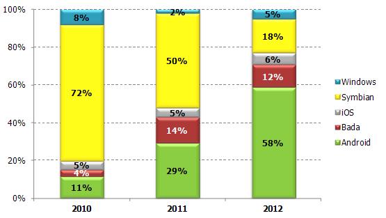 За последние три года структура российского и мирового рынков смартфонов по операционным системам кардинально изменилась: вместо доминировавших в 2010 г. смартфонов под управлением Symbian абсолютное лидерство в продажах захватили устройства на платформе Android.