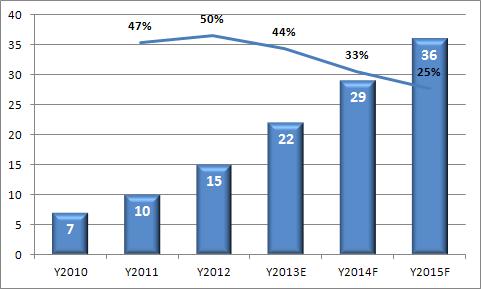 Рис. 2. Объемы и темпы роста мирового рынка магазинов приложений, 2010-2015 гг.