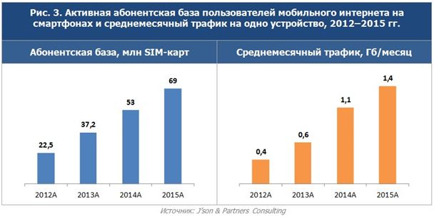 Одним из основных факторов роста трафика мобильной передачи данных также является замещение обычных мобильных телефонов смартфонами, в среднем потребляющими в десятки раз больше трафика. С 2012 г. активная абонентская база пользователей мобильного Интернета на смартфонах увеличилась в три раза, а трафик на одно устройство — в четыре раза (рис. 3).