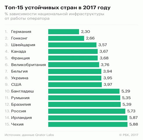 Согласно ежегодному рейтингу компании Qrator Labs, занимающейся противодействием DDoS-атакам, который опубликовал ресурс РБК, Россия в 2017 г. заняла 13-е место в мире по устойчивости национального сегмента Интернета к возможным сбоям. В своем исследовании компания проанализировала, насколько национальные сегменты Интернета различных стран (охвачены 244 государства) зависимы от работы одного конкретного оператора и какой процент других операторов в этом регионе потеряет связь с миром в случае сбоя в его работе. На первых позициях рейтинга — Германия, Гонконг и Швейцария.