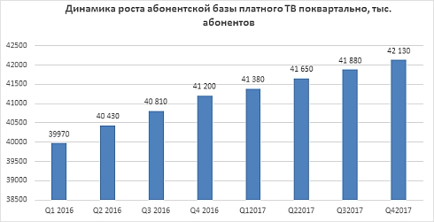 Отмечается, что в 2017 г. операторам не удалось привлечь значительное число абонентов, что говорит о насыщении рынка с точки зрения новых подключений. Сейчас операторы стараются увеличивать выручку с каждого абонента, предлагая больший спектр услуг. По-прежнему активен спутниковый сегмент, но более 75% подключений за отчетный период приходится на проводное вещание"