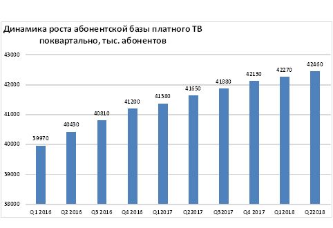 По предварительным данным ИАА TelecomDaily, общее количество абонентов платного ТВ в России по итогам II квартала 2018 г. составило 42,46 млн. Это на 190 тыс. абонентов больше, чем по итогам I квартала. Проникновение сервисов платного ТВ достигло 75%. Средний чек на одного абонента (ARPU) — 172 руб. в месяц (см. рис. 1).