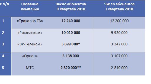 Пятерка крупнейших операторов платного ТВ по итогам II квартала 2018 г.