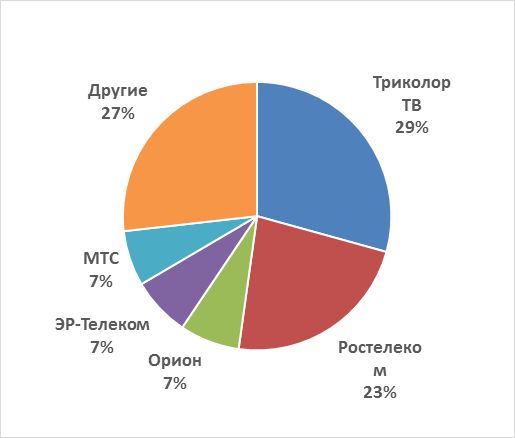 Таким образом, рынок развивается по двум основным направлениям: через органический рост («Ростелеком», «Триколор ТВ», «Орион») и через M&A-сделки («ЭР-Телеком») (см. круговую диаграмму).