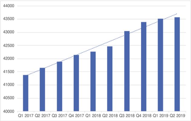 По предварительным данным ИАА TelecomDaily, общее количество абонентов платного ТВ в России по итогам 2Q2019 составило 43,605 млн домохозяйств. Квартальный прирост составил 80 тыс. домохозяйств (для сравнения, по итогам 1Q прирост равнялся 150 тыс. домохозяйств), это рекордно низкий показатель прироста за последнее десятилетие (менее 0,2%). Проникновение сервисов платного ТВ сохранилось на уровне чуть более 78%. Средний чек на одного абонента (ARPU) составил 180 руб. в месяц.