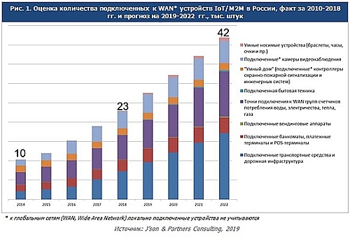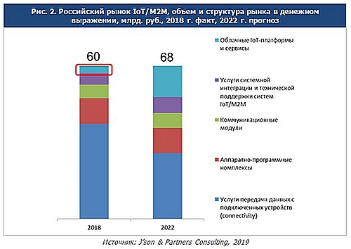 По прогнозу J’son & Partners Consulting, к 2022 г. количество подключенных устройств вырастет до 42 млн, но при этом в денежном (рублевом) выражении рынок будет стагнировать, увеличиваясь лишь на 4% ежегодно (до 69 млрд руб. в 2022 г.) (рис. 1 и 2).