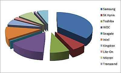 Однако значительная величина накопленных за прежние кварталы складских запасов у компаний, создающих на базе NAND-микросхем готовые накопители различных форм-факторов (SATA SSD, NVMe SSD, eMMc, всевозможные карты памяти и т. п.), послужила причиной снижения цен: выручка поставщиков NAND за второй квартал осталась приблизительно на уровне первого, — те же 10,8 млрд долл. США. В результате оптовая цена при прямых поставках с ОЕМ-фабрик за 1 Гбайт для накопителей SSD вплотную приблизилась к психологической отметке в 10 американских центов — а к концу года, по прогнозу DRAMeXchange, может опуститься ещё ниже.