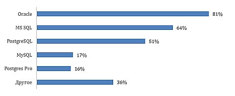 Проведенный TAdviser опрос** показал, что наиболее популярными СУБД в крупном бизнесе и государственном секторе являются Oracle (81%), Microsoft SQL (64%) и PostgreSQL (51%). При этом более 70% опрошенных организаций планируют миграцию с используемых СУБД на альтернативные системы в ближайшие три года, либо рассматривают такую возможность (в том числе 86% из опрошенных госорганизаций, включая госкорпорации, а также 66% респондентов, представляющих крупный частный бизнес — в первую очередь крупные промышленные компании, предприятия транспорта и энергетики).