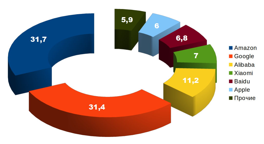 Глобальные продажи умных колонок (стационарных динамиков с постоянным подключением к Интернет-сервисам облачных голосовых помощников) во II кв. 2019 г. выросли почти вдвое по сравнению с аналогичным периодом годом ранее, до 30,3 млн единиц, свидетелтьствуют эксперты Strategy Analytics. Первенствовать на этом рынке продолжает компания Amazon, хотя доля её уменьшилась за год с 29,1 до 21,9%; на второй позиции — Google с примерно той же долей рынка, места с третьего по пятое занимают китайские Baidu, Alibaba и Xiaomi, и лишь замыкающей в шестёрке лидеров выступает Apple.