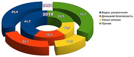 Не все сегменты умных гаджетов для домашнего применения будут развиваться одинаковыми темпами. Аналитики предрекают заметное снижение доли устройств для демонстрации видео и несложных интерактивных развлечений — таких как умные телеприставки Fire TV или Chromecast — за рассматриваемый период с 41,7% в 2019 г. до 29,9% в 2023-м (см. диаграмму). Несколько сократится и присутствие умных колонок в общем объёме поставок (с 16,5 до 14.3%), тогда как сегмент домашней безопасности и видеонаблюдения вырастет — с 19,2 до 22,1%.