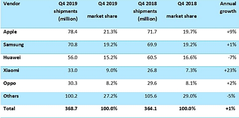 По данным Canalys, рост поставок смартфонов на мировом рынке за последние три месяца 2019 г. составил 1% в количественном исчислении (369 млн единиц). Это второй подряд квартал после сравнительно долгого перерыва, когда фиксируется увеличение отгрузок смартфонов в глобальном масштабе. Лидирует Apple, нарастившая свои поставки за квартал на 9%, за ней следуют Samsung (+1% и потеря первого места — впервые с IV кв. 2018 г.), Huawei (-7%; главным образом вследствие американских санкций), Xiaomi (+23%) и Oppo (+2%).
