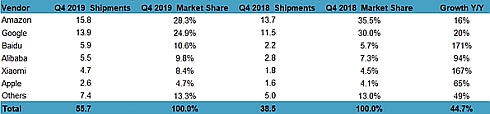 В то же время китайские умные колонки с цифровыми помощниками Baidu Duer OS, Alibaba Ali Genie и Xiaomi Xiao AI увеличили своё присутствие на рынке. Хотя все без исключения устройства этого типа в количественном исчислении демонстрировали за прошедший год рост поставок, динамика этого роста у компаний из КНР оказалась значительно более высокой. К примеру, если в IV кв. 2019 г. в мире было отгружено на 20% больше устройств с Google Assistant, чем за тот же период 2018 г., то для гаджетов под управлением Baidu Duer OS аналогичный прирост составил 171%. И это при том, что именно последние три месяца минувшего года стали для Google особенно удачными на рынке умных колонок, что было обусловлено дебютом новой версии продукта Nest Hub Max, расширением сети поставок и высокой маркетинговой активностью.
