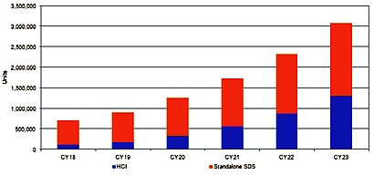 По оценке Informa PLC, в 2019 г. глобальные отгрузки решений HCI выросли на 24% год к году, а обособленных SDS — на 12% (всё — в денежном выражении). К 2023 г. объём сегмента HCI должен достичь 43 млрд долл. (пятилетний CAGR = 47%), а обособленных SDS — 42 млрд долл. (пятилетний CAGR = 18%). Всего же на рынке SDS в целом в 2019 г. 43% поставок в денежном выражении пришлось на облачных поставщиков услуг (включая гиперскейлеров), и только 4% — на телеком-компании, которые пока, очевидно, отстают в области внедрения программно-определяемых хранилищ от общеиндустриальных темпов.