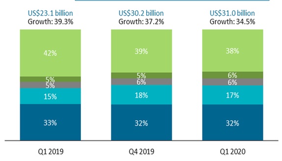 На сервисы, предоставляемые облачной инфраструктурой, отправленные на вынужденную самоизоляцию люди по всему миру не скупились. Об этом свидетельствует отчёт Canalys, в котором утверждается, что глобальная сумма расходов на услуги из облака за I кв. текущего года достигла 31,0 млрд долл. США, — на 34% больше, чем годом ранее.