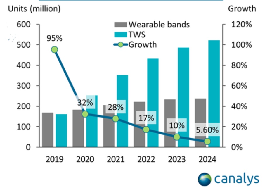 А на ближайшие пять лет Canalys прогнозирует что средний CAGR составит 6,7% для назапястных гаджетов и целых 19,8% для TWS.