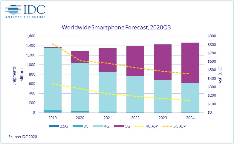 В географическом аспекте картина следующая: восстановление рынка Китая (самого большого из региональных) идёт медленнее, чем ожидалось. Связано это с тем, что основные бренды в стране переключились на выпуск 5G-моделей, и у потребителей поднебесной сузился выбор. В результате, как ожидают в IDC, средняя цена продаж (ASP) смартфонов в Китае вырастет на 11.4% относительно 2019 г., и всё это приведёт к снижению отгрузок на 11.4% в 2020 г. Но на других развитых рынках, включая Северную Америку, Западную Европу и Японию, в четвёртом квартале ожидается рост в связи с предпраздничными закупками и различными «чёрными пятницами». 5G — основная движущая сила на рынке уже сейчас.