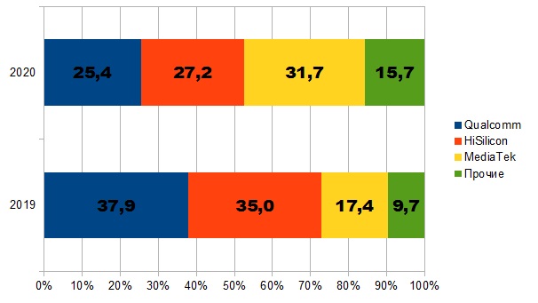 Доли ведущих поставщиков SoC для смартфонов на китайском рынке, в 2019 и 2020 гг., в %