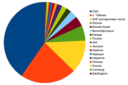 Подавляющее большинство этих вендоров (см рисунок) , разумеется, — американские компании (40%); сильно также присутствие Тайваня (22%) и КНР (13%). Есть и один российский производитель, — GS Nanotech (входит в состав холдинга GS Group), НИОКР-подразделения и мощности которого располагаются на территории частного инновационного кластера «Технополис GS» в Калининградской области.