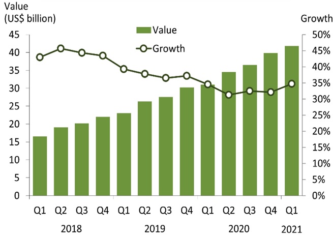 По оценке Canalys, мировые расходы на услуги, предоставляемые облачными провайдерами (AWS, Micrososft Azure, Google Cloud и пр.), в I кв. 2021 г. впервые в истории превысили 40 млрд долл. США. Общий объем продаж составил 41,8 млрд, что на 35% превышает достижение того же периода годом ранее.