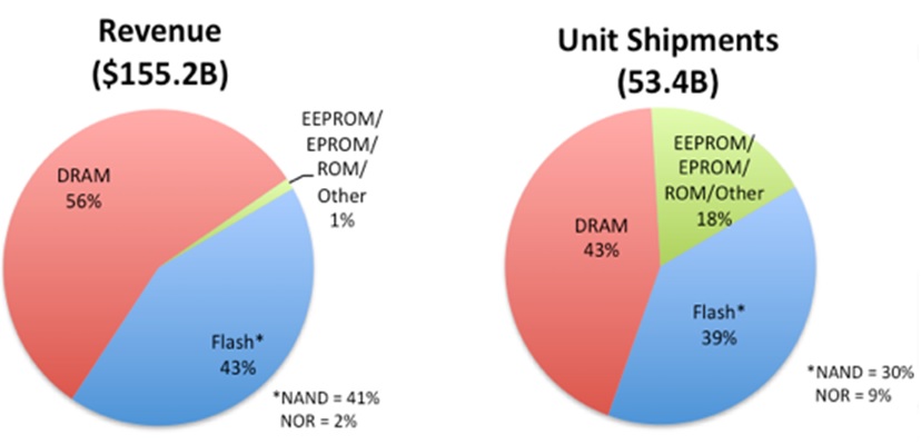 Детализированный по секторам прогноз на 2021 г. демонстрирует по-прежнему заметную долю «немассовых» микросхем памяти (EEPROM, ROM, SRAM и т. п.) в количественном исчислении, — 18%. Однако в денежном выражении на этом рынке безусловно доминируют DRAM (56% всей выручки) и флэш-память (NAND и NOR в совокупности — 43%).