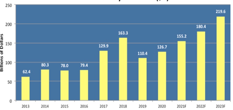 Примечание: до 2020 г. — статистика, с 2021 по 2023 г. — прогноз
