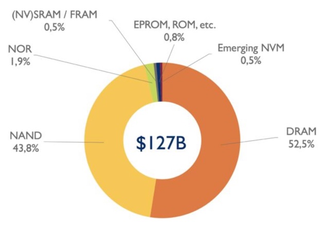 Недавний отчёт Yole Développement о состоянии мирового рынка памяти содержит довольно детализированную его раскладку по различным типам полупроводниковых хранилищ информации, постоянных и временных, за 2020 г. В денежном выражении здесь безусловно доминируют ( см рис. 1) DRAM с долей 52,5% и NAND (43,8%), а из менее распространённых типов однопроцентный рубеж перешагивает лишь NOR (схожая с NAND разновидность флэш-памяти, — более скоростная, но обеспечивающая меньшую плотность записи данных на единицу площади микросхемы) с долей 1,9%. Общий объем рынка — 127 млрд долл. США