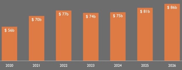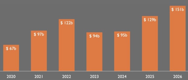 Рис.2 Прогноз по выручке на мировом рынке DRAM до 2026 г., млрд долл. США