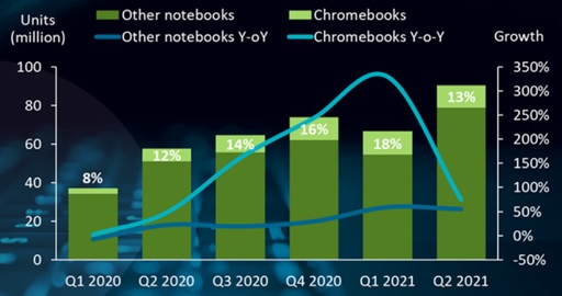 Всего персональных компьютеров (в широком смысле, включая планшеты) в мире с апреля по июнь 2021 г. было поставлено 121,7 млн единиц, а хромбуков — 11,9 млн, что на 75% больше, чем за второй квартал прошлого года. По темпам роста эта категория ПК опережает все прочие: классические ноутбуки, к примеру, демонстрируют увеличение поставок примерно на 50% год к году, а планшеты, которых за этот период было отгружено 39,1 млн единиц, — лишь 4%.