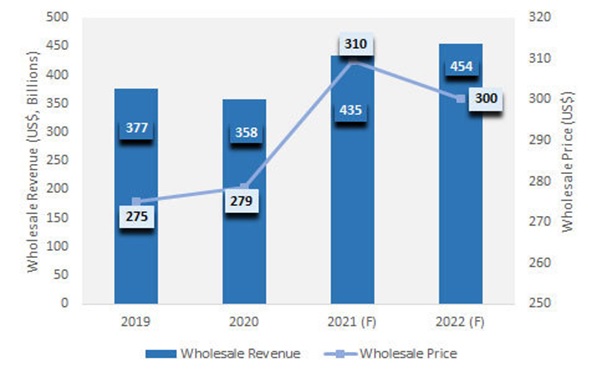 При этом глобальный объём продаж смартфонов в деньгах, согласно прогнозу, в текущем году вырастет на +21% в годовом выражении и достигнет $435 млрд, — это максимальный показатель за всю историю развития рынка (см. рисунок). Причины такого увеличения — как в росте количества проданных смартфонов, по прогнозу — на +9% YoY, так и в повышении средней цены. В 2021 г. впервые за последние 9 лет средняя цена на мировом рынке превзошла $300. Увеличение цены — это результат нескольких факторов: тут и переход в смартфонах к технологиям 5G, и сложности с поставкой смартфонов из-за нехватки компонентов, и такие технические инновации, как складные/гибкие экраны в смартфонах Samsung.
