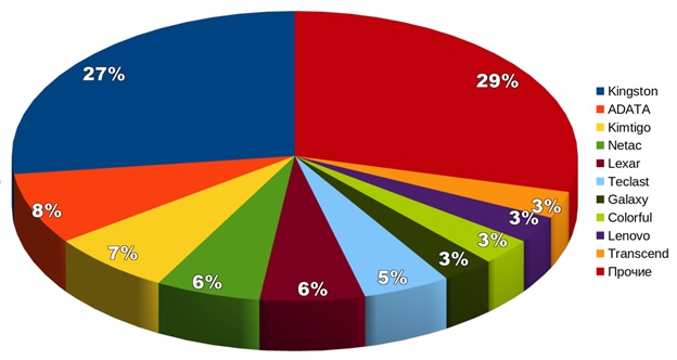 Около 65% этих поставок пришлось на компании, изготавливающие полупроводниковые накопители на основе приобретаемых на стороне модулей: ту же Kingston, ADATA, почти не известную в России, но широко представленную в мире китайскую Kimtigo и т. д.