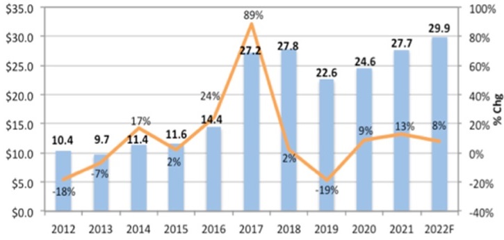 Аналитики IC Insights оценили расходы мировых заказчиков модулей памяти NAND. Это производители SSD, карт памяти и иных устройства хранения на её основе. По итогам 2022 г. объем этого рынка составит по оценкам аналитиков 29,9 млрд долл. США. Это на 8% больше, чем годом ранее, а также выше прежнего рекорда за всё время наблюдений (27,8 млрд долл.), достигнутого в 2018 г.