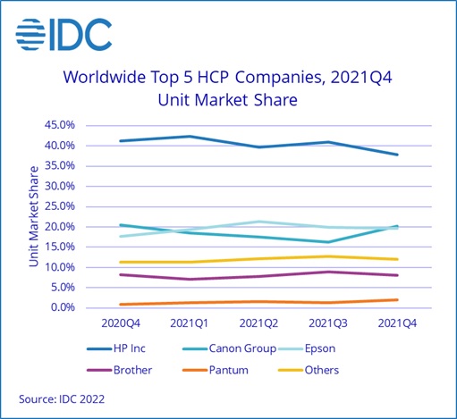 Поставки принтеров и МФУ сократились в четвёртом квартале 2021 г. почти во всех регионах мира . Наименьшее сокращение (-0.9%) отмечено в Азиатско-Тихоокеанском регионе (за исключением Японии и Китая) (APeJC) благодаря успехам в лазерном сегменте рынка, особенно в подсегменте монохромных устройств формата A4.