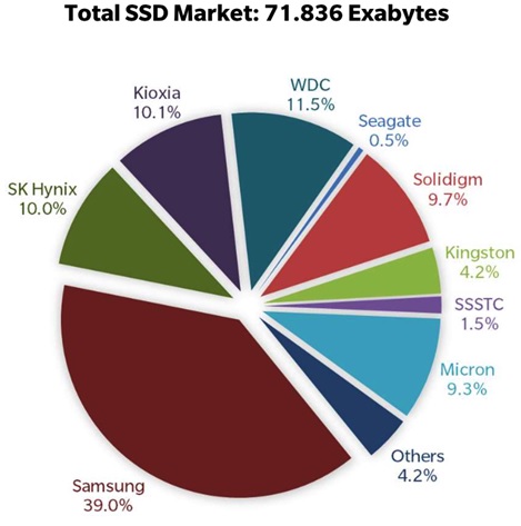Интересно, что если распределение по долям рынка ведущих брендированных поставщиков SSD в натуральном выражении в I кв. текущего года примерно соответствует прошлогоднему, то по емкости лидер рынка SK Hynix явно сократила своё присутствие — с 12,5% в 2021 г. до 10,0% в 1Q22.