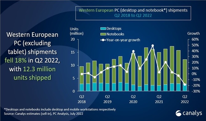 Во втором квартале текущего года рынок ПК (ноутбуки, десктопы и рабочие станции) в Западной Европе, согласно данным компании Canalys, упал на 18% в годовом выражении и составил 12.3 млн штук. Особенно пострадал сегмент ноутбуков, где в период Q2 2022 отмечено падение на 26% в годовом выражении, их отгрузки составили 9.5 млн штук. При этом сегмент десктопов за год вырос на 22% до 2.7 млн штук благодаря активному росту коммерческого спроса на ПК для предприятий (см. рис. 1).