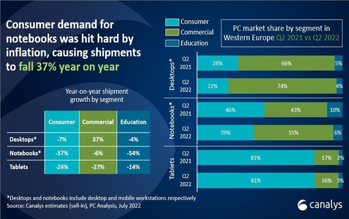 Высокая инфляция ( Евростат (Eurostat) — статистический офис Евросоюза, сообщил, что в зоне евро во 2-м квартале инфляция в среднем составила 8%) привела к изменению структуры рынка между потребительским и коммерческим сегментами. Поставки десктопов и ноутбуков в потребительском сегменте в Q2 упали на 34%, многие покупатели решили сэкономить домашний бюджет и отложить покупку. В то же время спрос на высокопроизводительную технику в сфере бизнеса в постковидный период был относительно высокий, так что за исключением сферы образования поставки коммерческих ПК сократились всего на 3%. Крупные организации в этот период имели возможность обновить ИТ-технику.