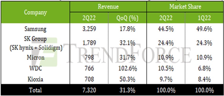 Невзирая на довольно ощутимое снижение оптовых цен на микросхемы NAND для SSD корпоративного уровня (а, возможно, в какой-то мере и благодаря ему), выручка изготовителей таких устройств хранения данных во II кв. 2022 г. существенно выросла — до 7,32 млрд долл. США, сразу на 31,3% от уровня предыдущего квартала.