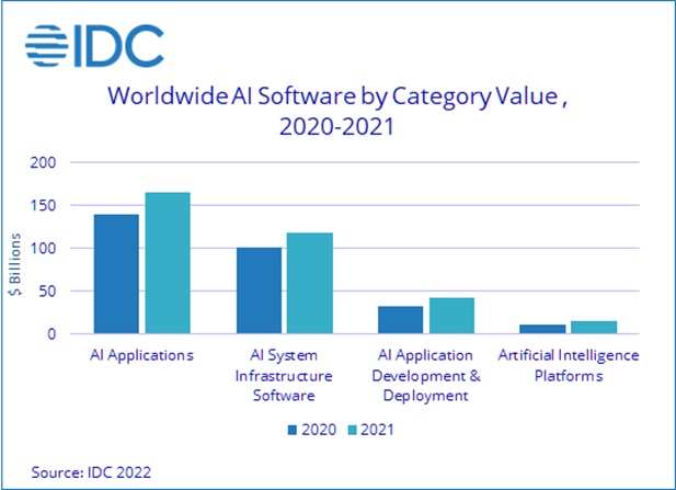 Раздел программных средств — крупнейший сегмент всего рынка ИИ, на него в 2021 г. пришлось свыше $340 млрд. Более половины этой суммы составили затраты на приложения ИИ (AI Applications). Но самый быстрый годовой рост — на 36.6% — показала категория платформ ИИ (Artificial Intelligence Platforms), развивавшаяся с малой базы (см. рисунок).