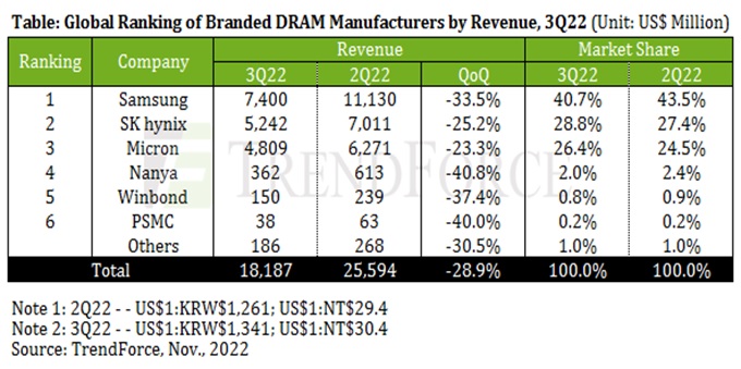 По оценке TrendForce, в III кв. 2022 г. выручка глобальных поставщиков модулей DRAM составила 18,19 млрд долл. США, что на 28,9% меньше, чем кварталом ранее. Это второй по масштабу квартального спада период со времён глобального финансового кризиса 2008 г. — и первое с тех самых пор по-настоящему серьёзное сокращение продаж.