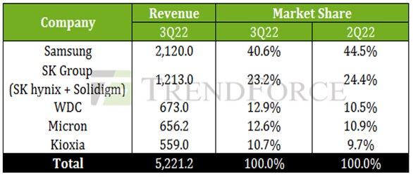 Агентство TrendForce оценило выручку поставщиков SSD корпоративного класса за III кв. 2022 г. в 5,22 млрд долл. США, что на 28,7% меньше уровня II кв.