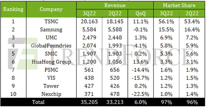 TSMC по-прежнему продолжает доминировать, получая более 50% всей этой выручки (и нарастив в III кв. свою долю дополнительно как раз за счёт заказов Apple). Samsung удерживает ранее отвоёванные позиции, а более мелкие (в основном, со штаб-квартирами на Тайване) производители полупроводников в основном теряют выручку на фоне усиления общемирового кризиса и роста неопределённости с расходами на ИТ-товары как частных потребителей, так и корпоративных заказчиков.