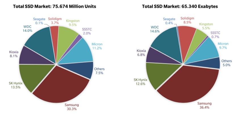 1. Слева — по количеству отгруженных накопителей в млн. шт. Справа — по суммарной емкости, в Экзобайтах