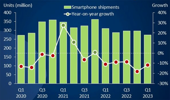По итогам I кв. 2023 г. в Canalys зафиксировали снижение отгрузок смартфонов в глобальный канал на 12% год к году. Величина спада конечно немалая, однако в последнем квартале 2022 г. она достигала почти 20%, да и в целом за прошлый год мировые поставки смартфонов просели на 12% от уровня 2021-го. На этом основании аналитики делают предварительный вывод о возможной стабилизации смартфонного рынка.