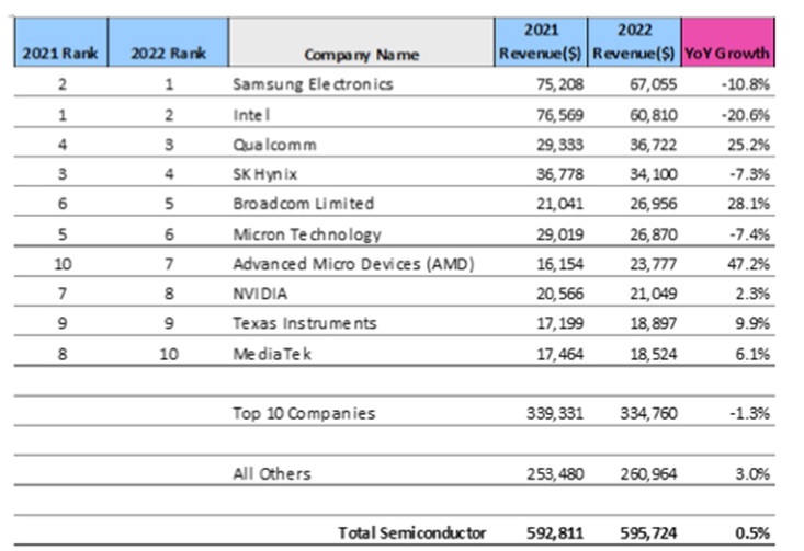 Что же касается вендоров, то по объёмам выручки Intel уступила в 2022 г. первое место Samsung Electronics (продемонстрировав почти вдвое более выраженный по динамике спад продаж). А лучше всех в плане прироста этого показателя ощущали себя из первой мировой десятки AMD (+47,2% год к году — в основном из-за поглощения Xilinx), Broadcom (+28,1%), Qualcomm (+25,2%), Texas Instruments (+9,9%), MediaTek (+6,1%) и Nvidia (+2,3%).
