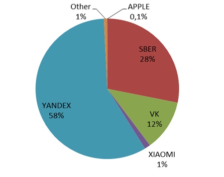 При этом примерно 98% всех поставок приходится на три российских бренда: Sber, VK и Yandex. Однозначным лидером отечественного рынка является Yandex (см. рисунок).