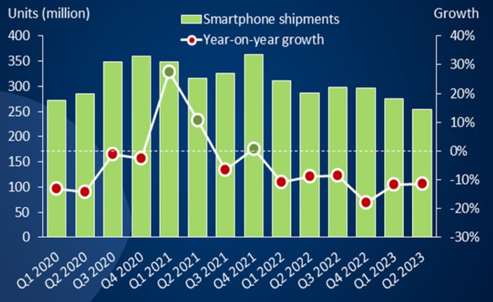 Как уже робко предполагали в Canalys, подводя итоги I кв. текущего года, динамика глобальных поставок смартфонов, судя по всему, нащупала дно. Речь здесь именно о динамике, а не об отгрузках в абсолютном количественном выражении. Если с января по март мировые поставки смартфонов сократились год к году на 12%, то с апреля по июнь аналогичный спад составил уже 11%. Учитывая, что наиболее провальным за последние примерно три года по этому показателю стал IV кв. 2022-го, аналитики взяли на себя смелость утверждать, что это вот небольшое, но вполне измеримое снижение скорости сокращения поставок можно рассматривать как первый предвестник грядущего (в некоторой перспективе) восстановления смартфонного рынка.
