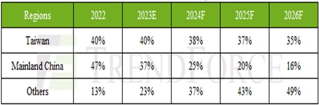 Объёмы SMT-производства серверов на предприятиях ODM в % по регионам (Тайвань, материковый Китай, прочие) по годам, оценка и прогноз