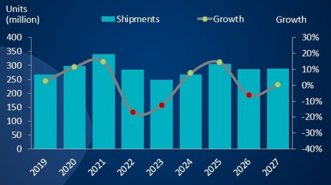 Глобальные поставки ПК по годам (оценка на 2023 г.) и прогноз (2024 г. и далее), столбцы, млн единиц, и их динамики, линия, %, правая шкала