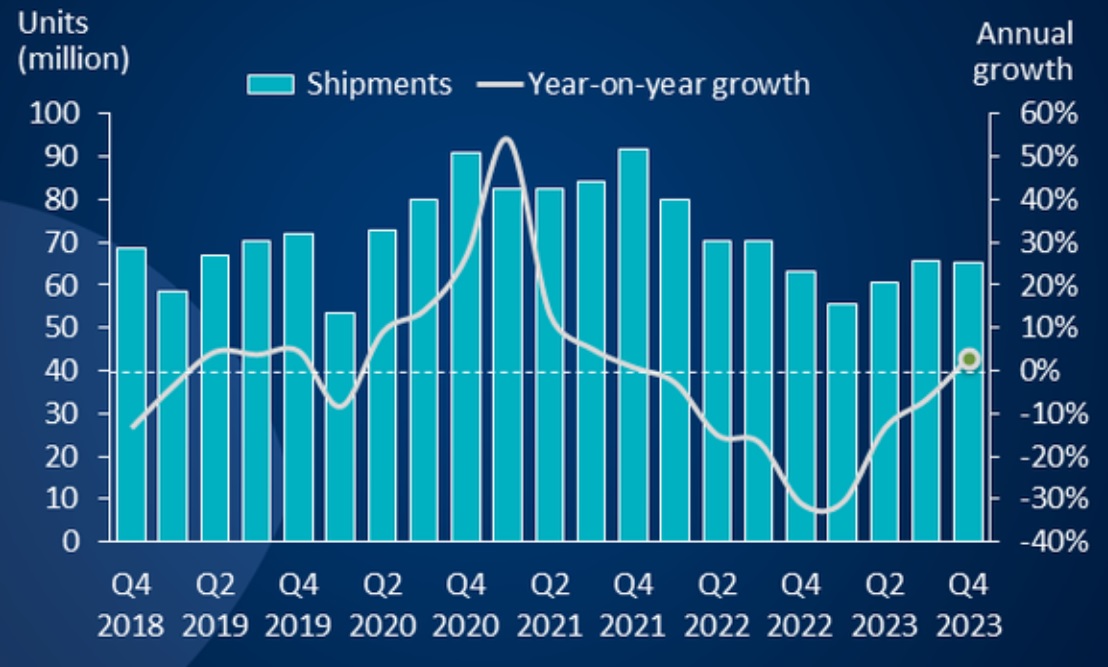 Длительная тенденция к сокращению отгрузок персональных компьютеров в мире, что начала проявляться с I кв. 2022 г., наконец потеряла актуальность в IV кв. 2023-го. По подсчётам компании Canalys, всего за октябрь-декабрь минувшего года вендорами ПК было поставлено партнёрам 65,2 млн таких систем, — на 3,1% больше, чем за тот же период 2022-го (см. рисунок). Львиная доля указанных отгрузок пришлась на ноутбуки (51,6 млн единиц), число которых выросло на 4% год к году, тогда как поставки десктопов снизились на 1%. Всего же по итогам 2023 г. глобально оказалось отгружено 247 млн ПК, что на целых 13% меньше, чем годом ранее.